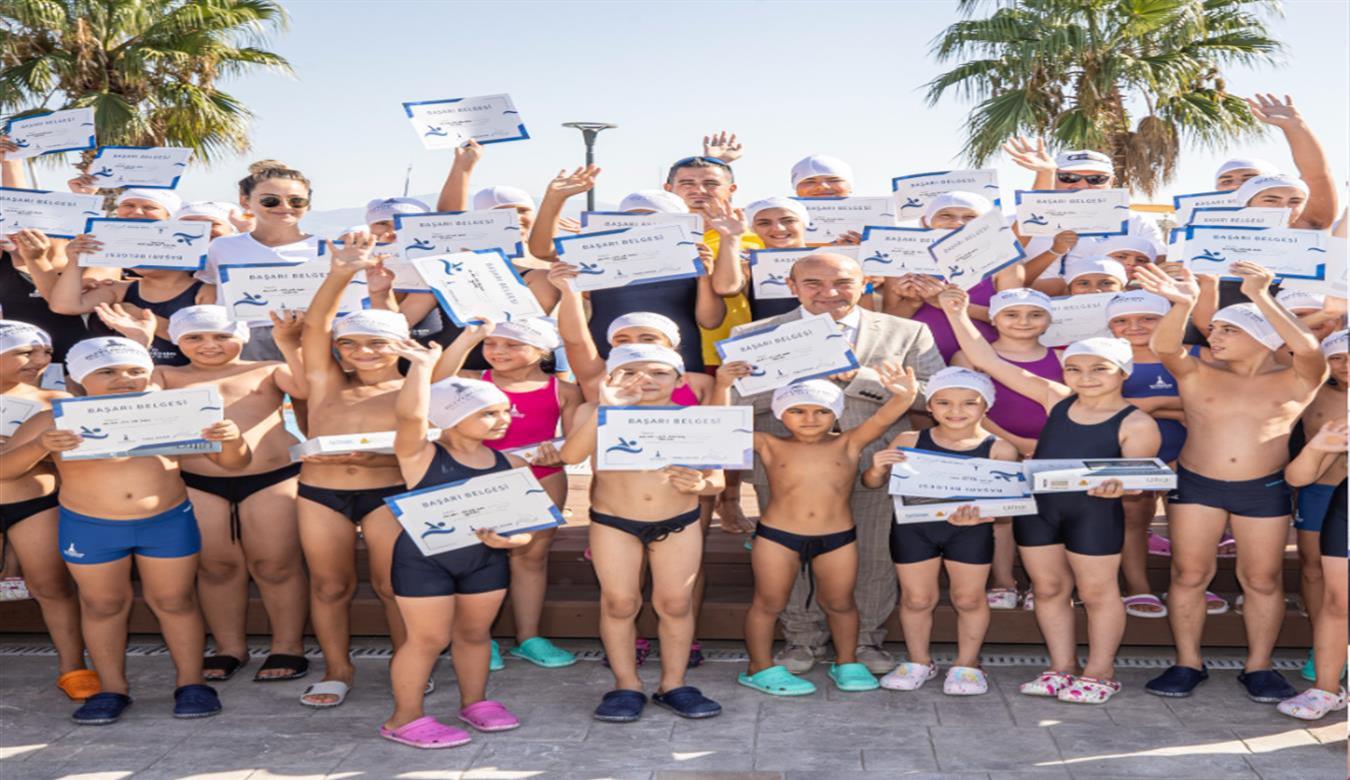 130 children aged 6-12, who successfully completed the swimming course at Izmir Marina, received their certificates from the Izmir Metropolitan Municipality Mayor, Mr. Tunç Soyer.